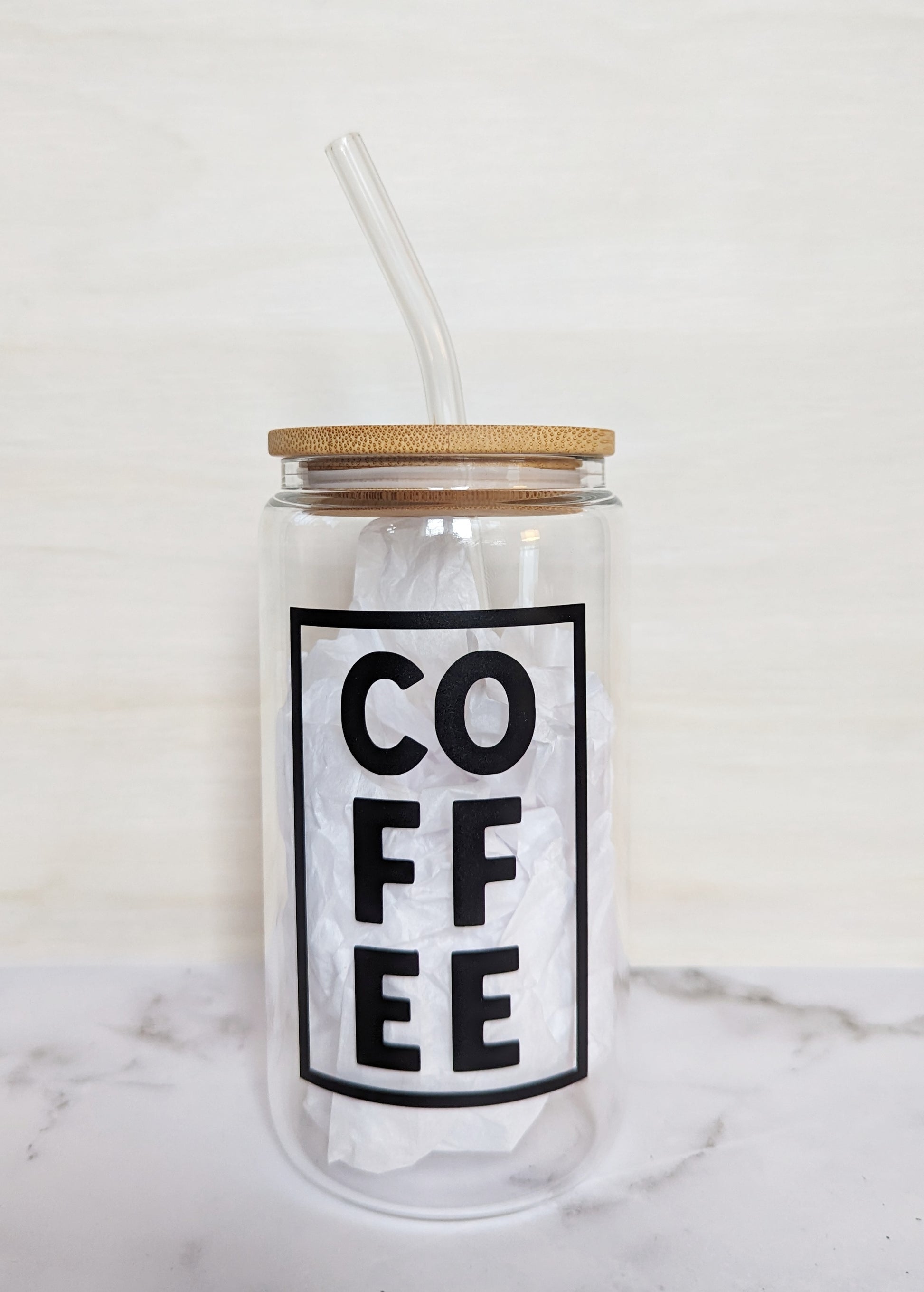 Description: Beer can-shaped glass tumbler the word coffee in a frame in black vinyl.