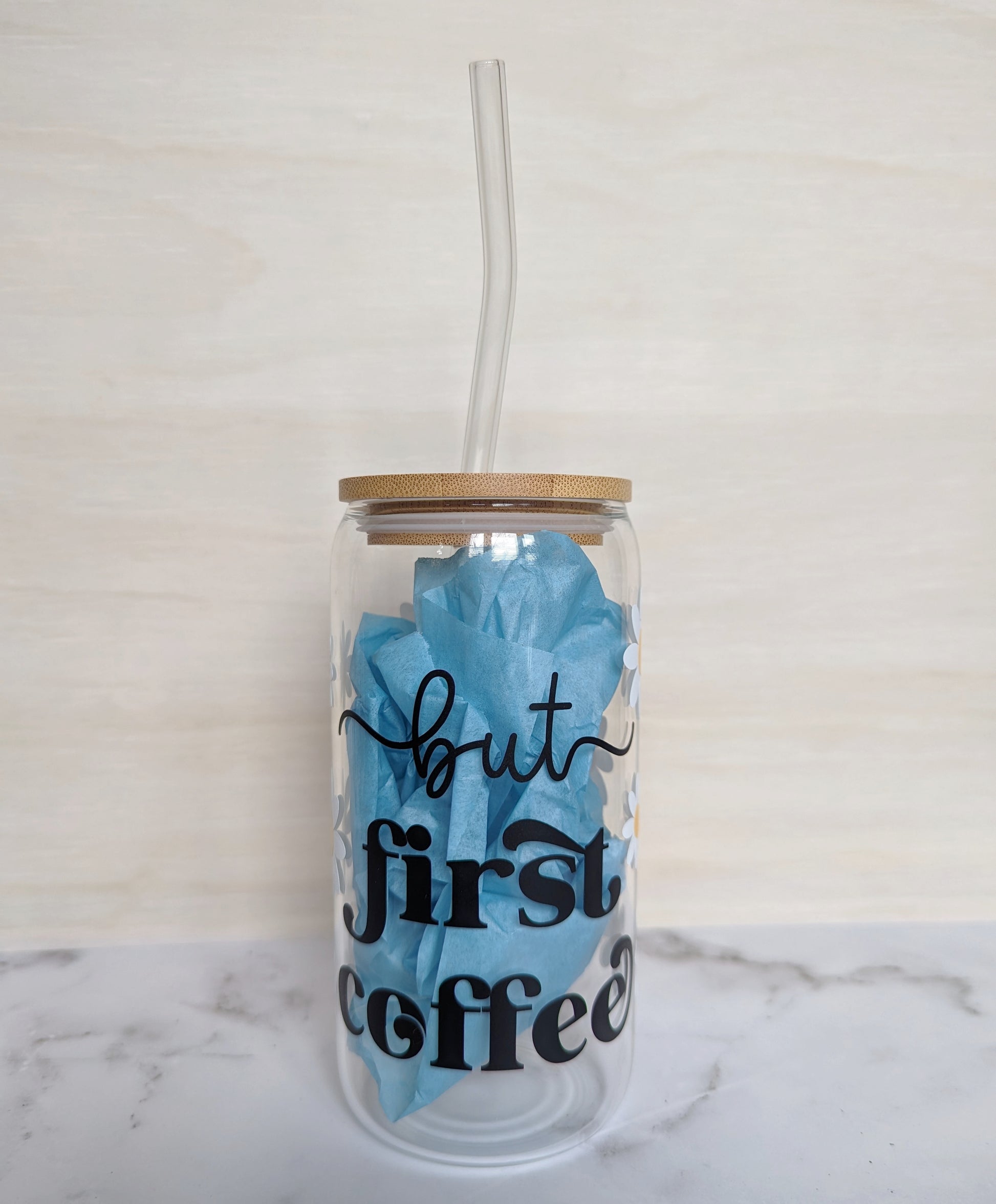 Description: Beer can-shaped glass tumbler with the phrase "but first coffee" in black vinyl and daisies in vinyl.