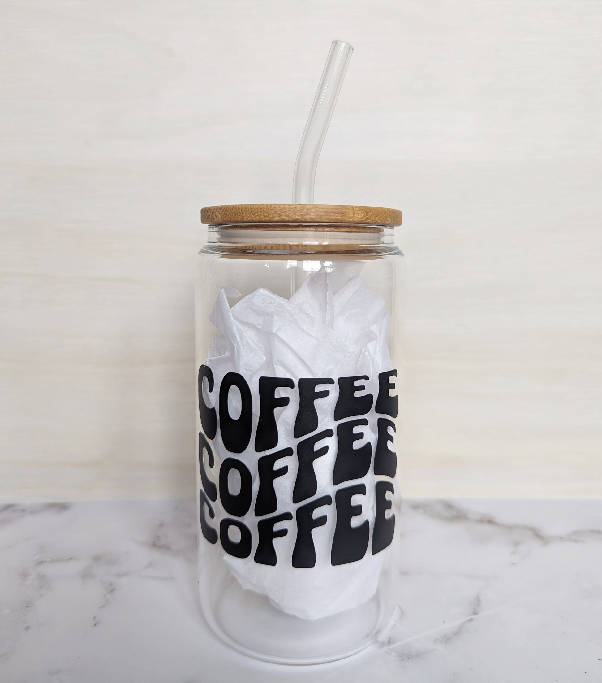 Description: Beer can-shaped glass tumbler with the word coffee three times and wavy in black vinyl.