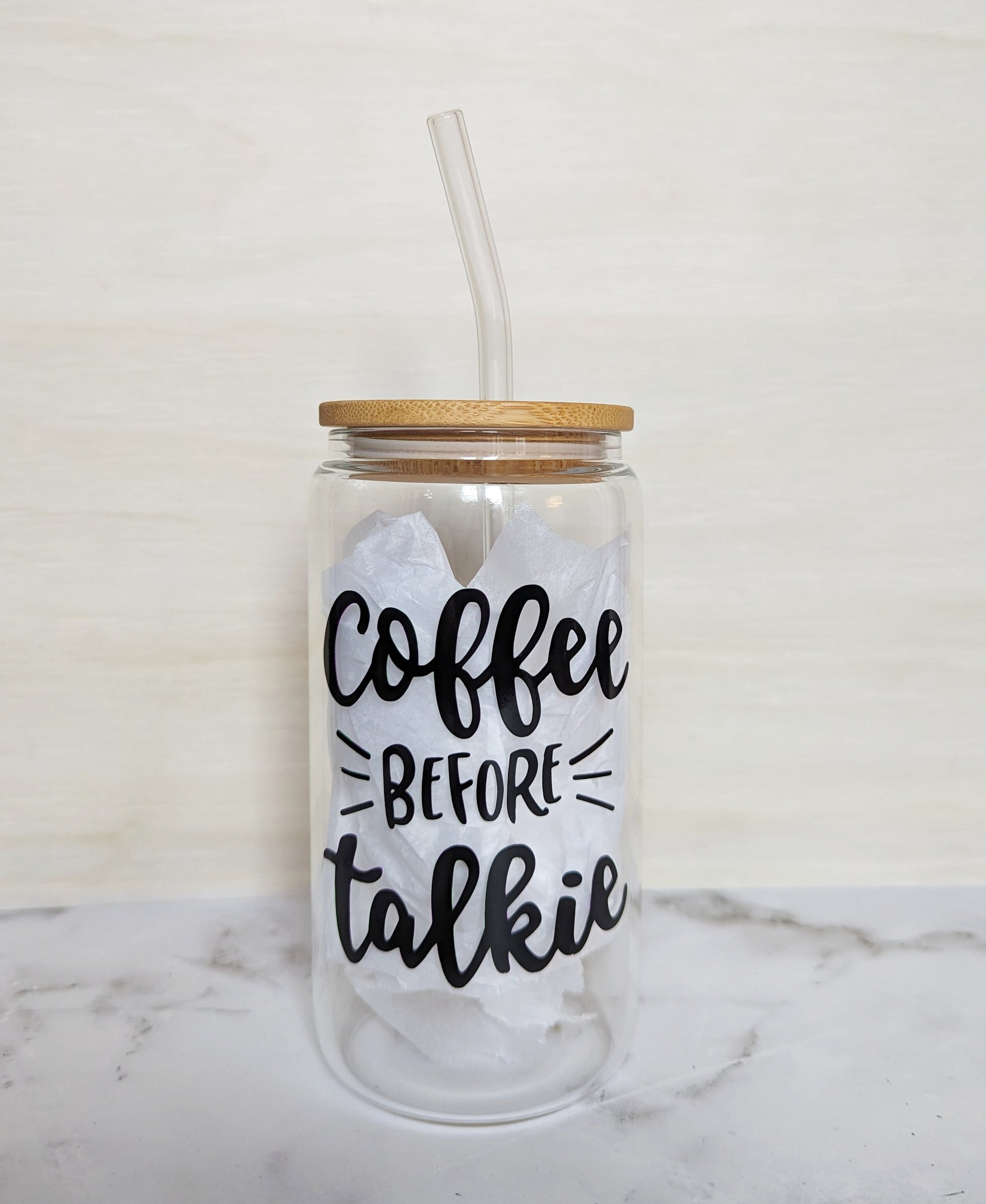 Description: Beer can-shaped glass tumbler with the phrase "coffee before talkie" in black vinyl.