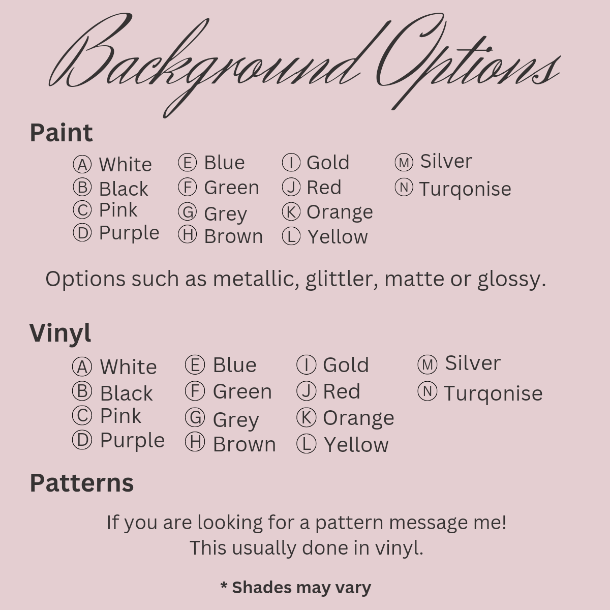 Options are listed, to create your own today, don't see what you are looking for or have questions email me at pinkknight1986@gmail.com today to get started!