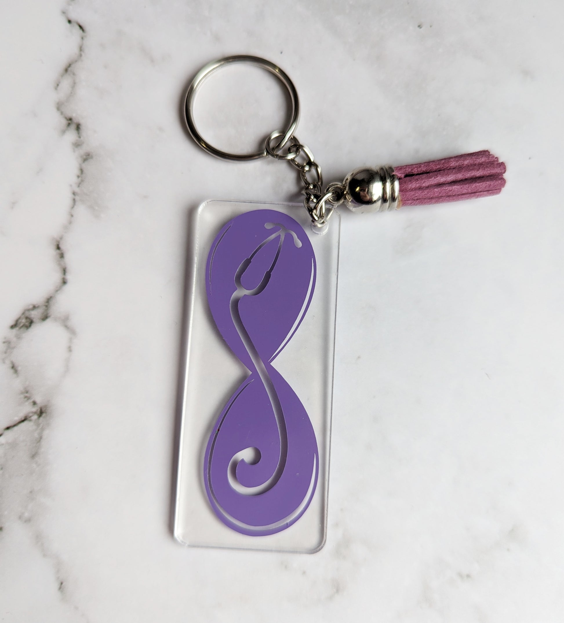 Rectangle acrylic keychain with a vinyl purple decal of an infinity symbol with a stethoscope cut out with a purple tassel.