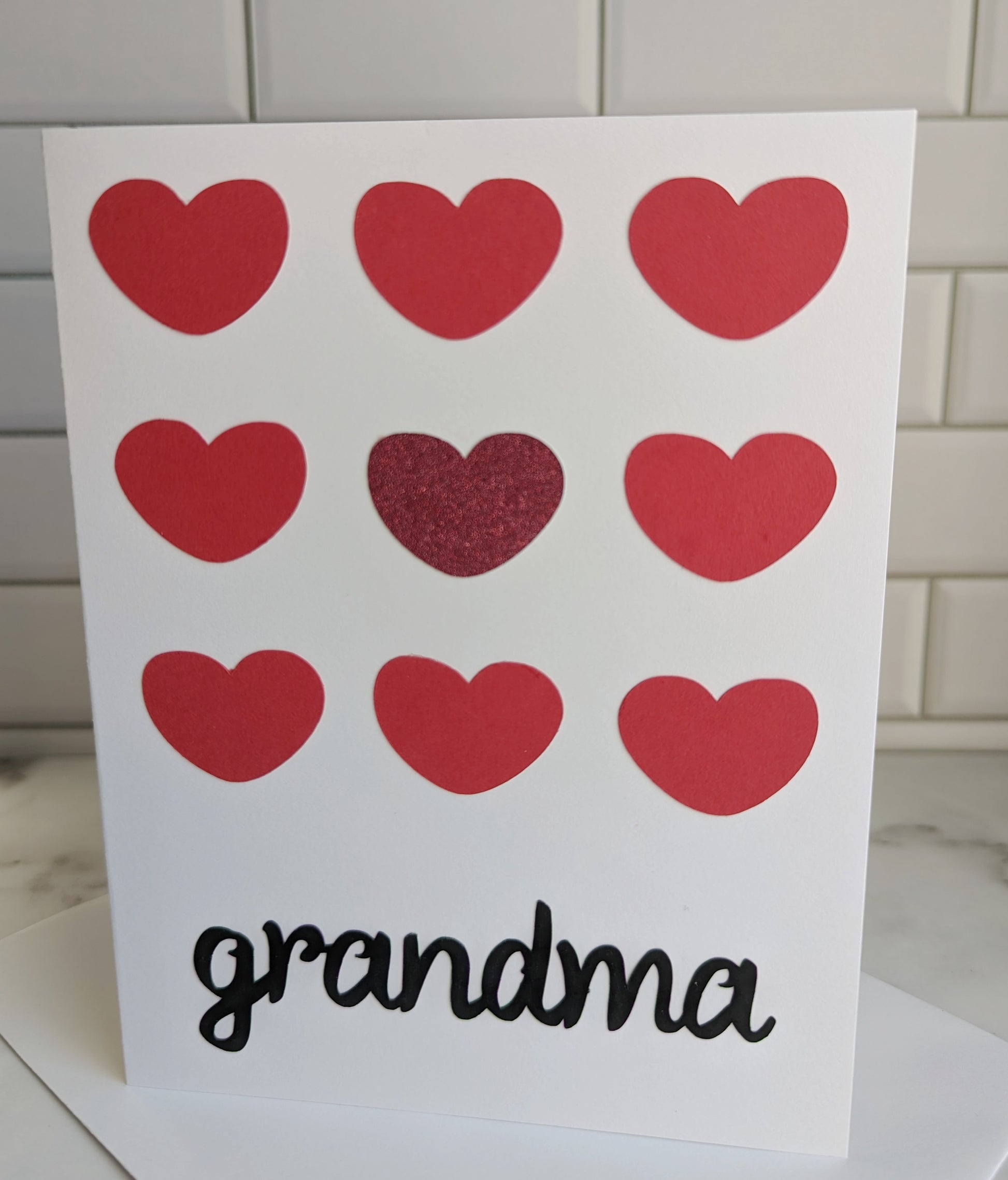 Front - has 1 glitter heart in the middle with 8 red hearts surrounding. Grandma is cut out in in black.