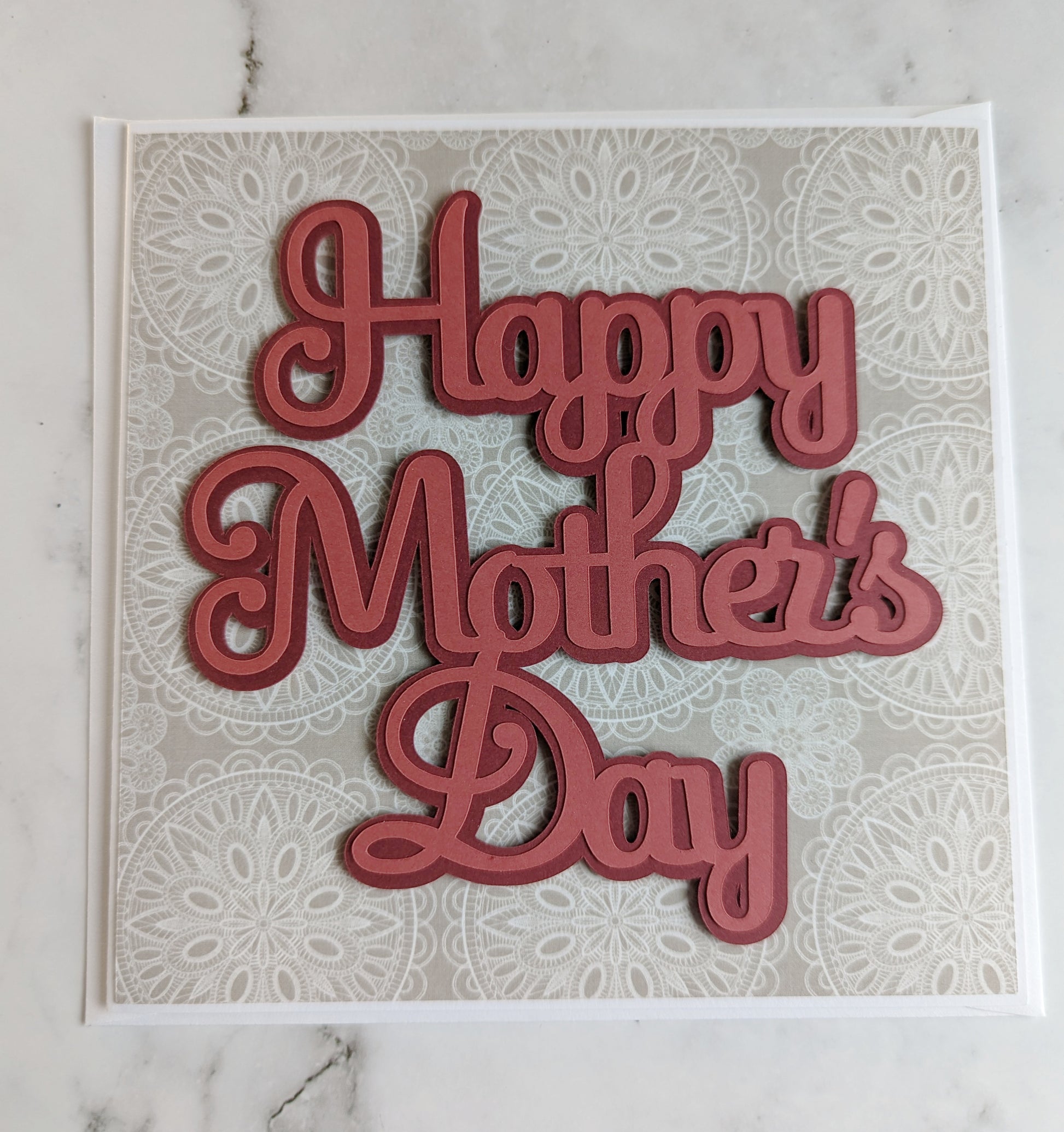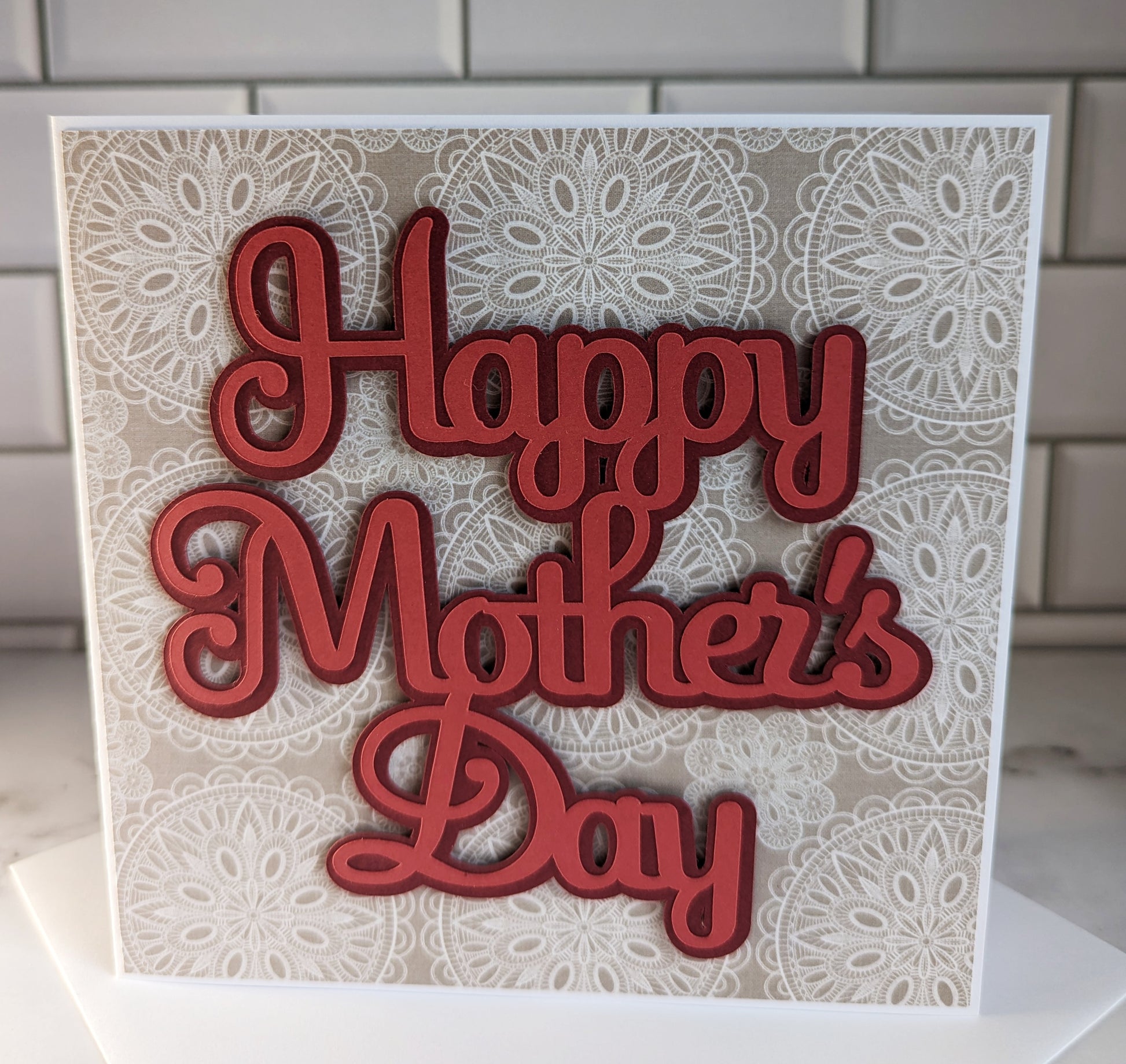 Front Happy Mother's Day in red cardstock with a dark red outline and a beige backing with a white design.