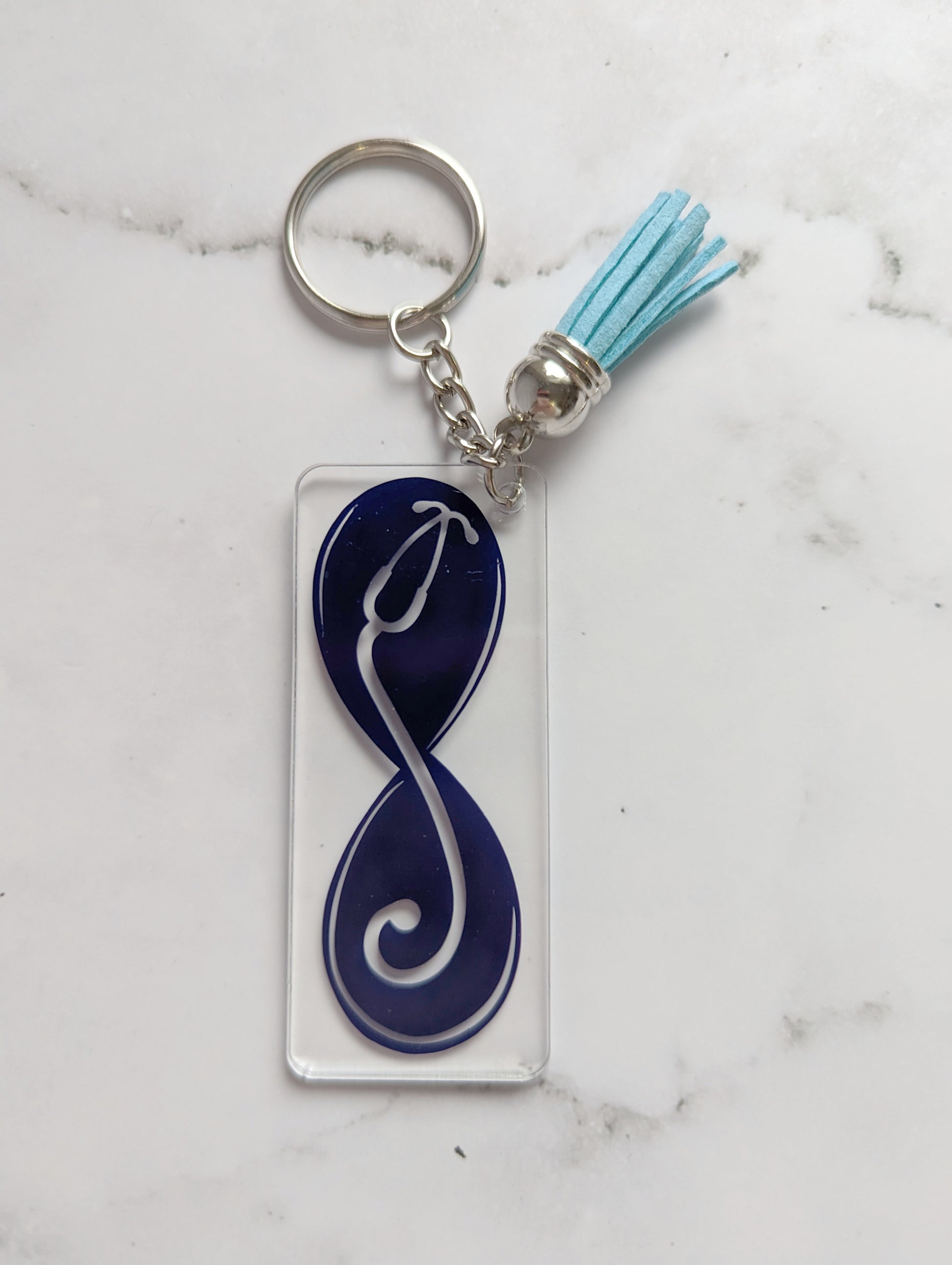 Rectangle acrylic keychain with a vinyl blue infinity symbol with a stethoscope cut-out decal with a light blue tassel.