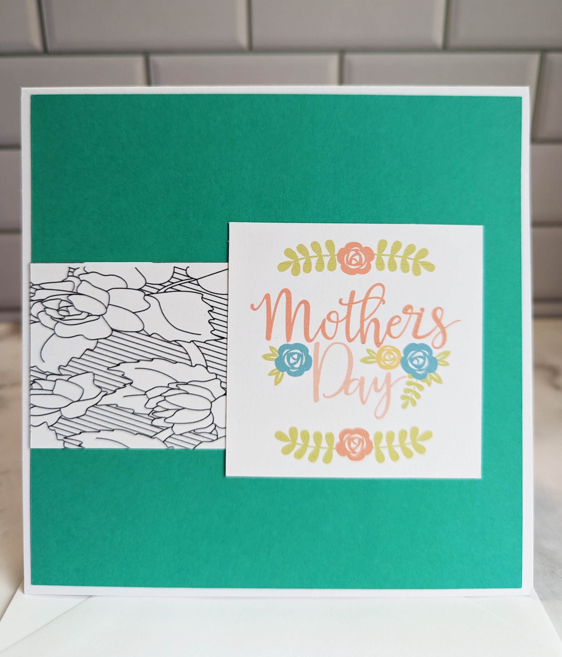 Front - Mother's day wording with floral images, black and white flower banner and a turquoise backing.